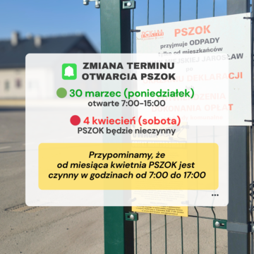 24 marca 2026Zmiana terminu otwarcia PSZOKZmiana terminu otwarcia PSZOK w Jarosławiu