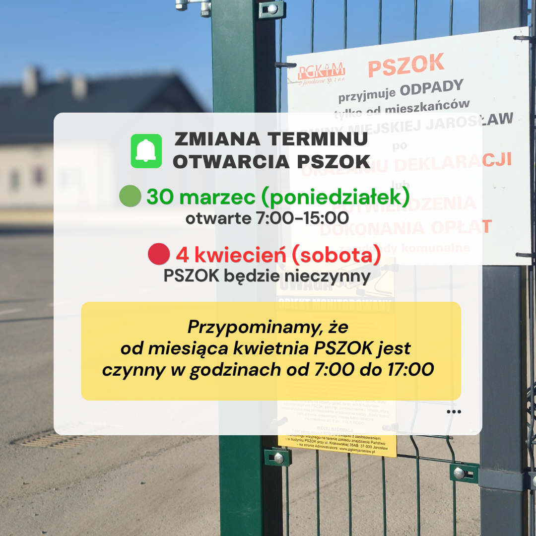 Informujemy mieszkańców Jarosławia, że Punkt Selektywnej Zbiórki Odpadów Komunalnych (PSZOK) przy ul. Krakowskiej 35 AB w tygodniu przedświątecznym będzie czynny wyjątkowo: